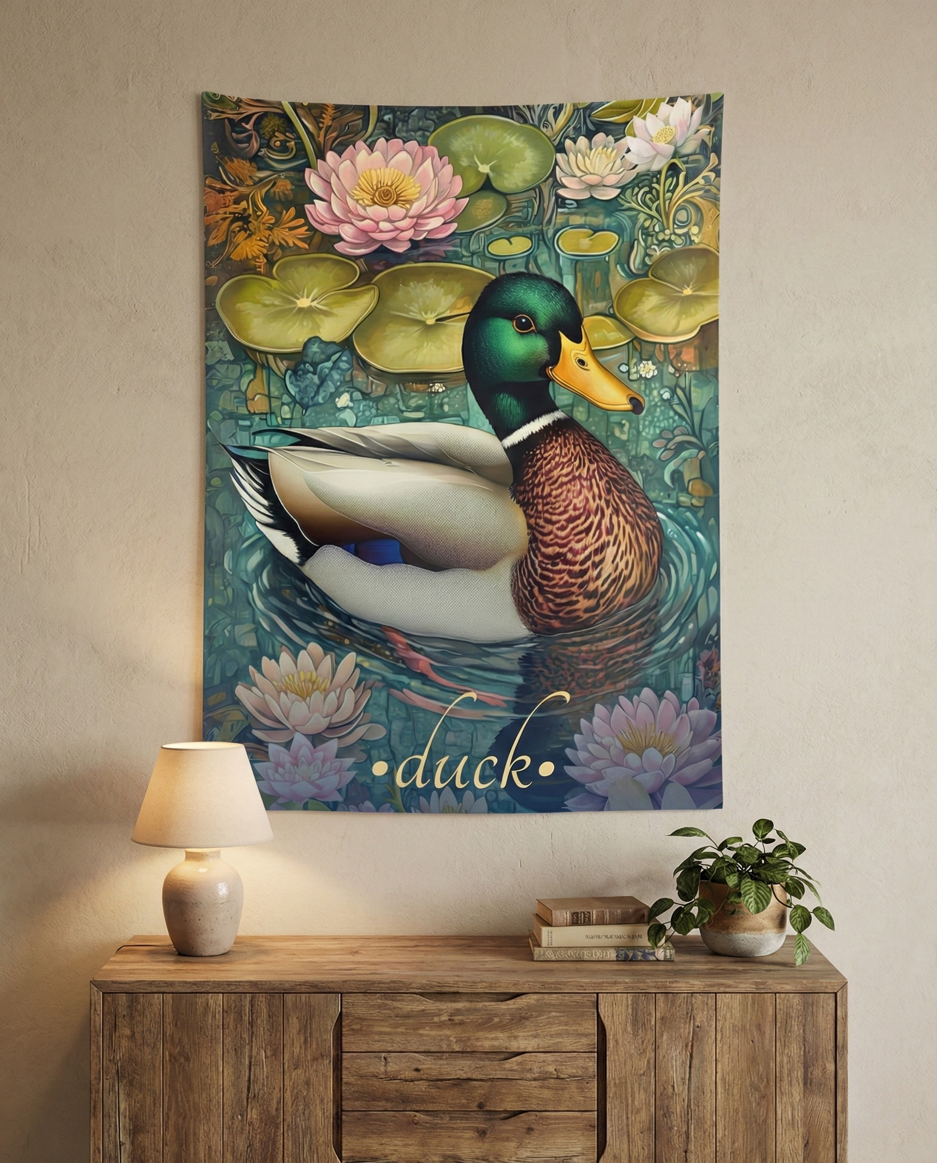 Glide into stillness with our Duck Wall Tapestry, featuring a vibrant mallard resting among blooming lotus and golden lily pads. With its rich colors and mirror-like water, this tapestry captures quiet confidence, natural grace, and the joy of floating peacefully through the world.