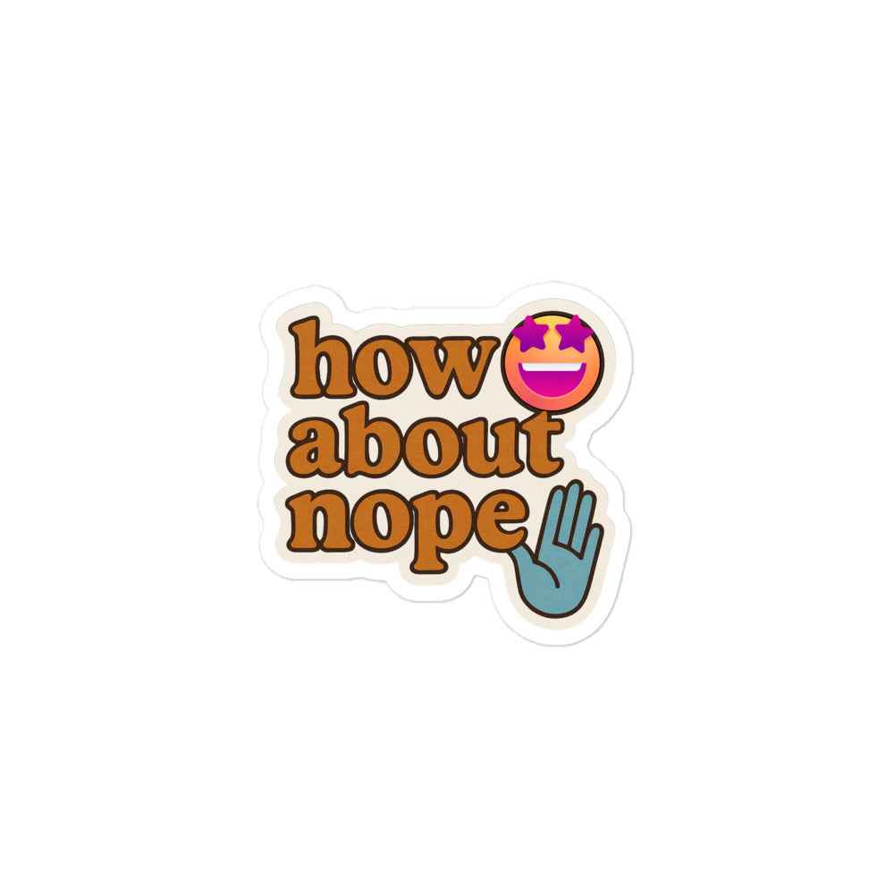 For when you want to say “no” with style and a smile. The How About Nope sticker is your colorful, emoji-fueled boundary-setter. Featuring expressive lettering, starry-eyed sarcasm, and a raised hand of polite refusal, it’s perfect for anyone who’s done people-pleasing—and doing it with flair.