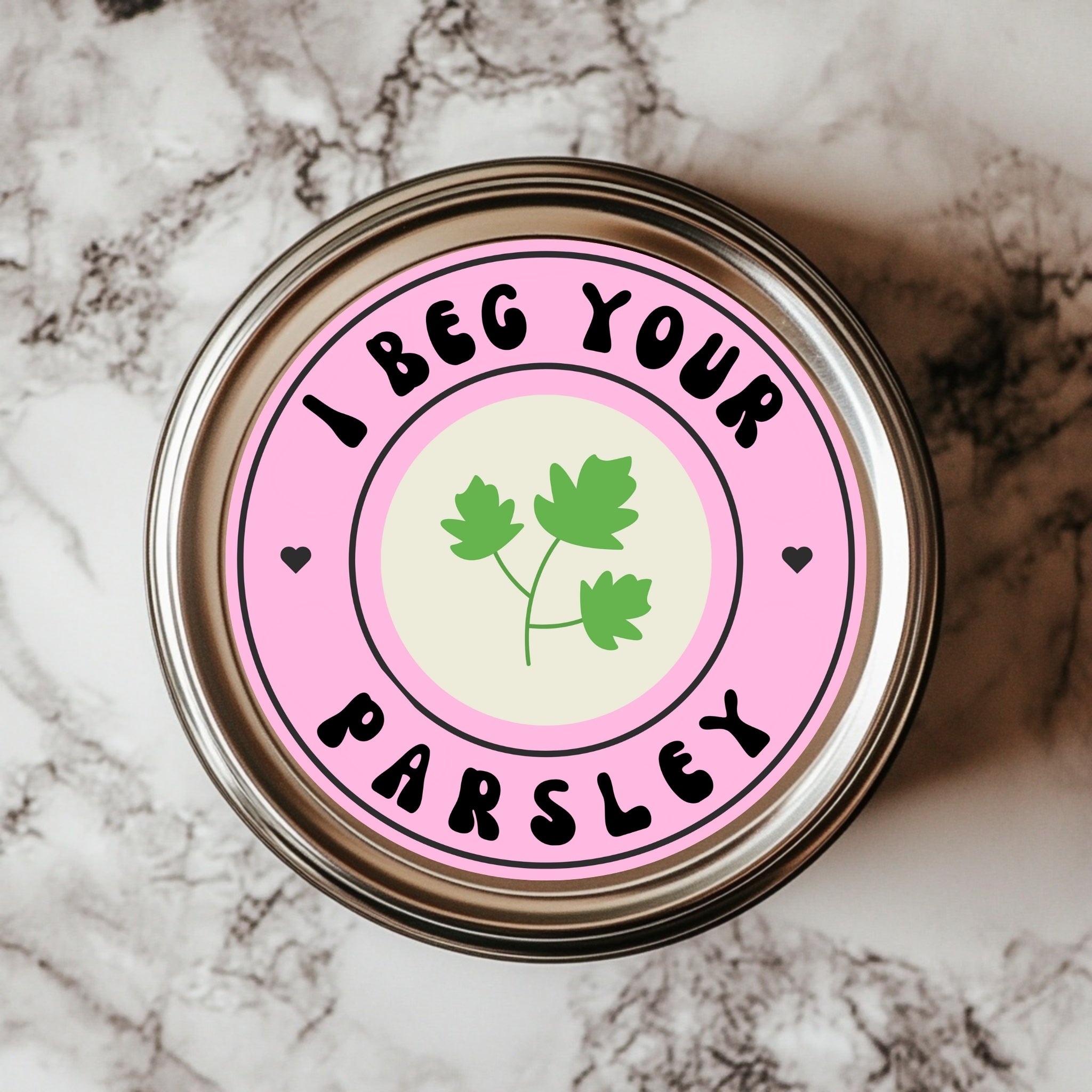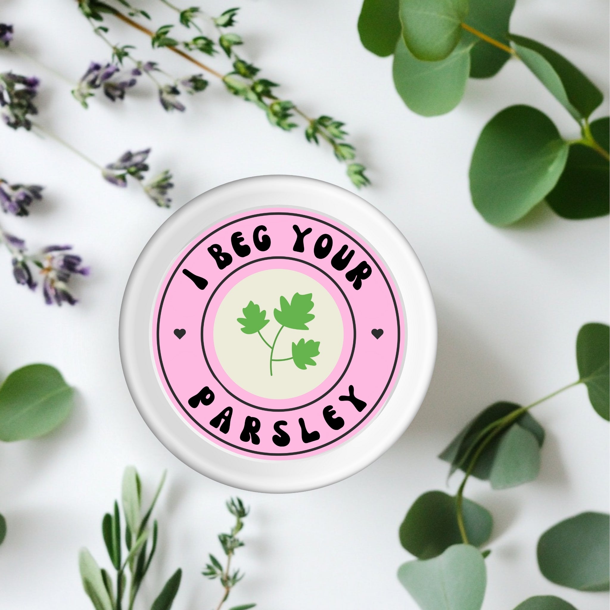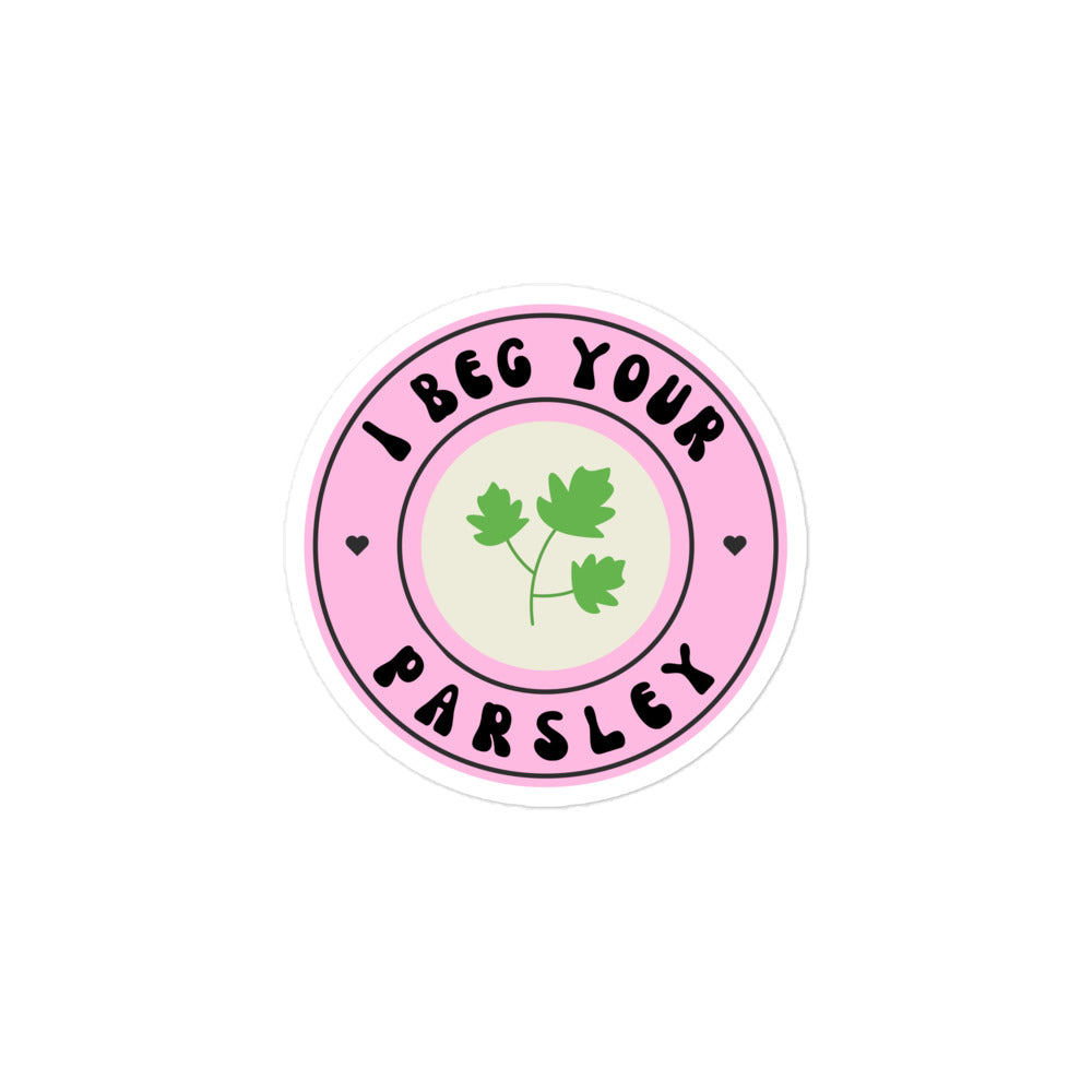 Make your spice jars or gift wraps extra sassy with our “I Beg Your Parsley” sticker — a lighthearted pun that brings charm and cheekiness to your kitchen or craft projects. With its soft pink design and parsley leaf illustration, this 2.25x2.25" kiss-cut sticker is perfect for herb jars, planner pages, or thoughtful packaging. A must-have for pun lovers, plant parents, and anyone who enjoys a side of humor with their herbs.